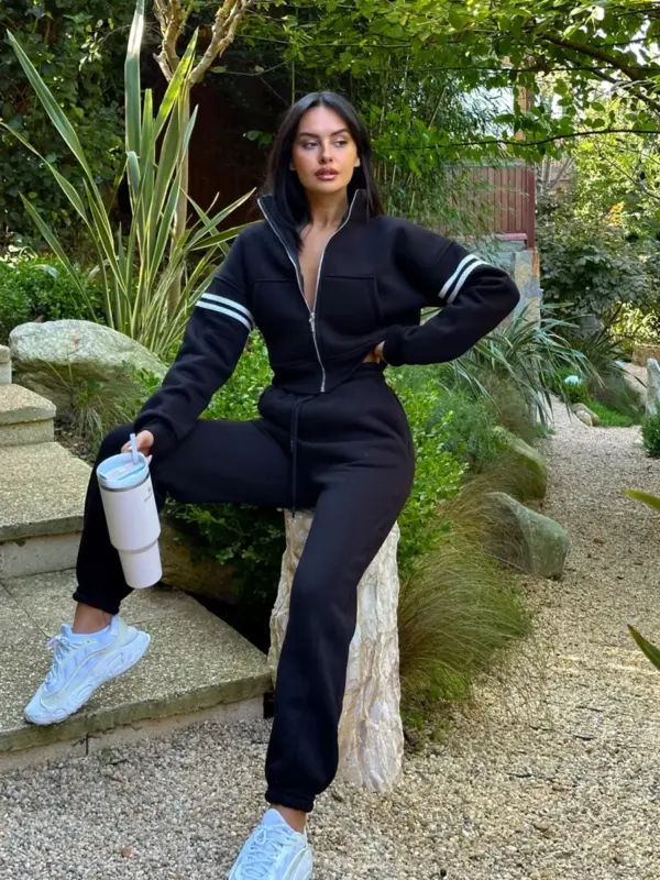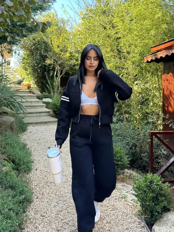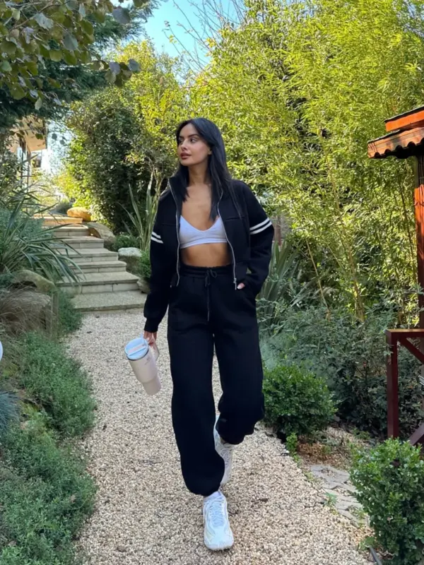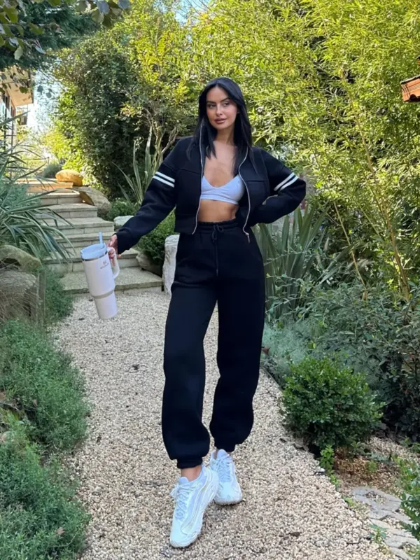 Ova dvodjelna trenerka savršeno je udobna, mekana i topla – idealan izbor za hladnije dane. Basic dizajn s detaljem pruge omogućava nošenje u setu ili svakog komada zasebno, što je čini svestranom za razne kombinacije.