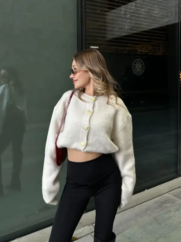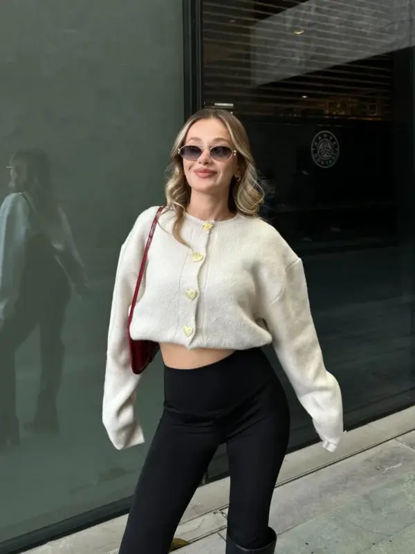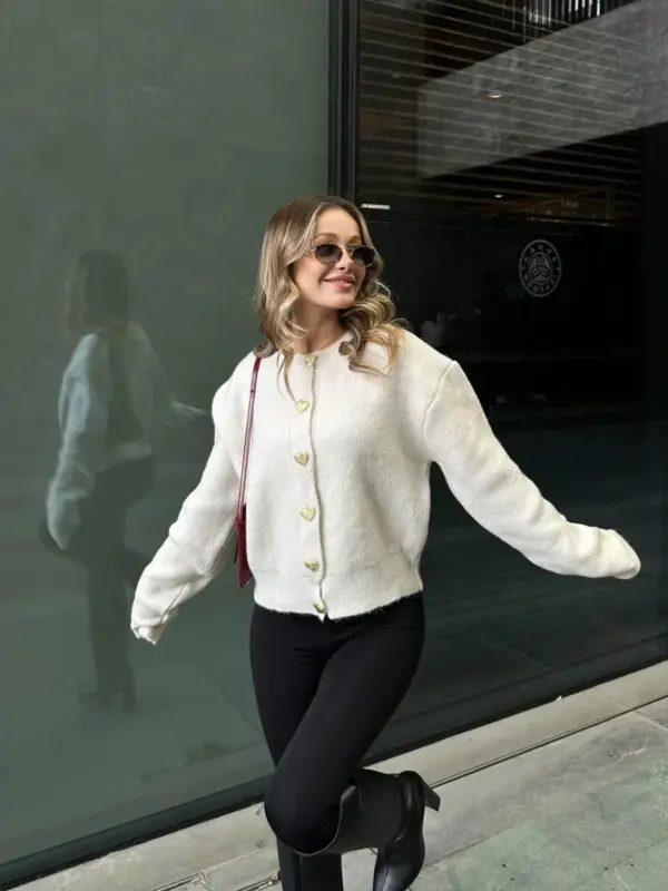 Pleteni kardigan s dugim rukavima. Kopčanje na preklop sa reljefnim gumbima zlatne boje sprijeda.