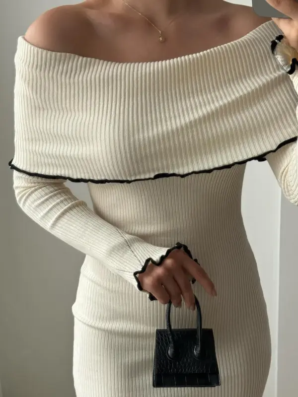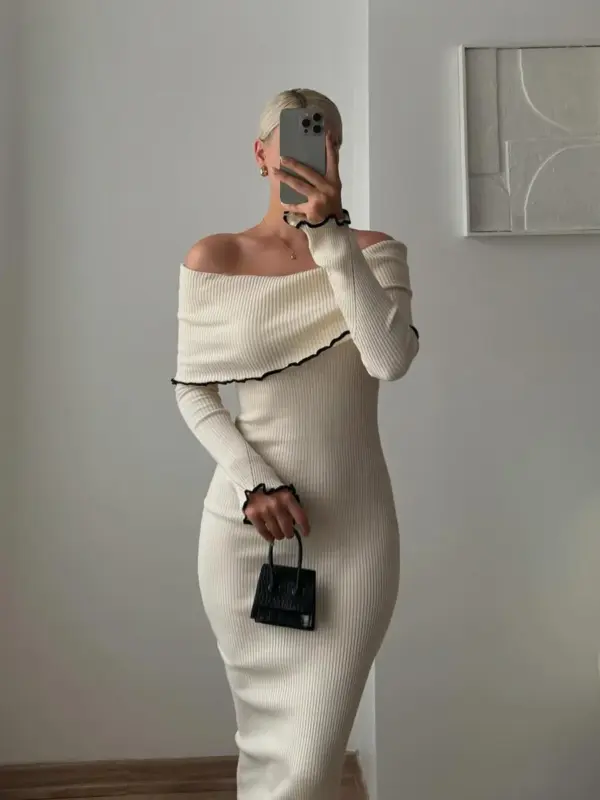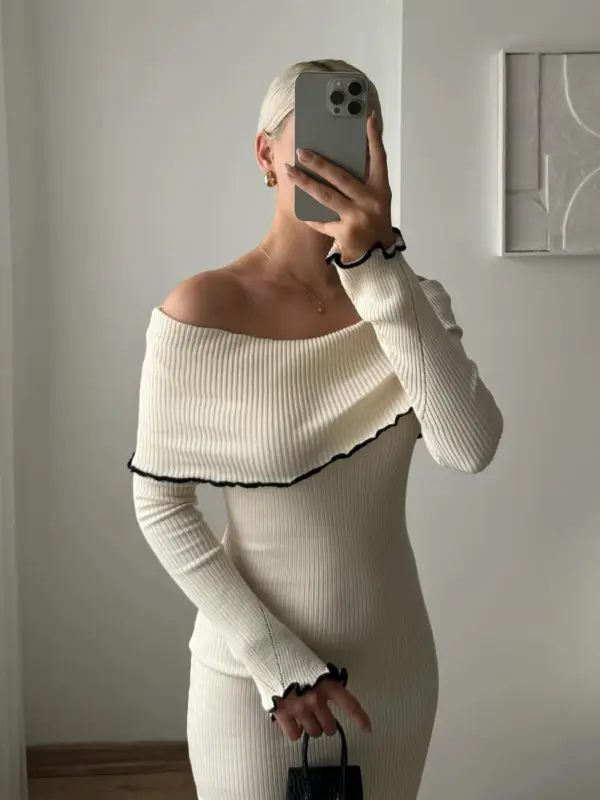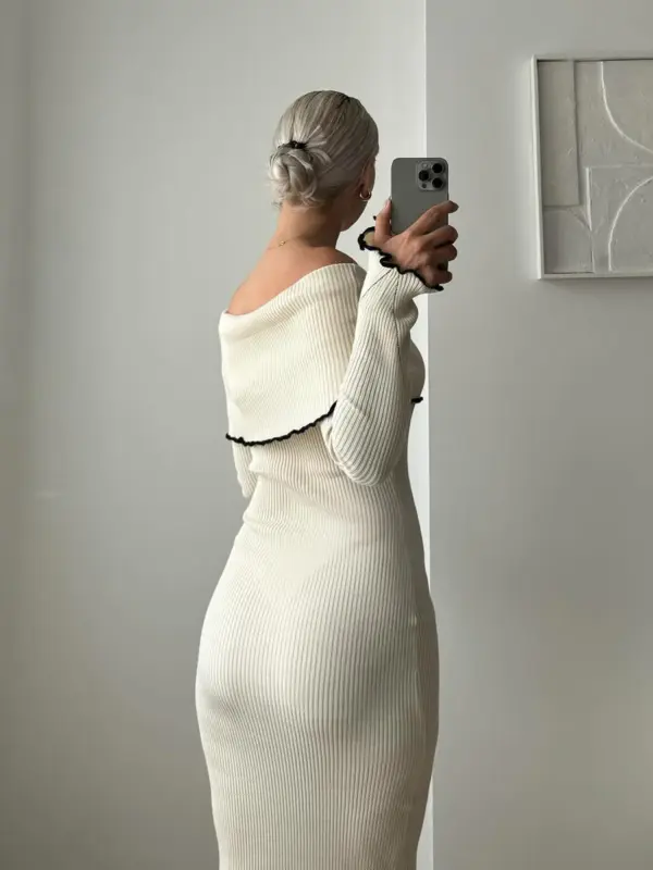 Ova kontrastna midi triko haljina sa rebrastom teksturom odiše elegancijom i modernim stilom. Dizajnirana sa spuštenim ramenima, idealna je za posebne prilike ili elegantne večernje izlaske. Rebrasta tekstura dodaje sofisticiranost, dok kroj naglašava siluetu, čineći ovu haljinu pravim izborom za sve koje traže spoj jednostavnosti i profinjenosti.