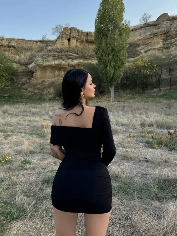 Mini haljina asimetričnog kroja s naborima, ističe figuru svojim modernim dizajnom. Zahvaljujući asimetričnom kroju, ova haljina donosi dinamiku u izgled i čini je savršenim izborom za večernje izlaske i partije.