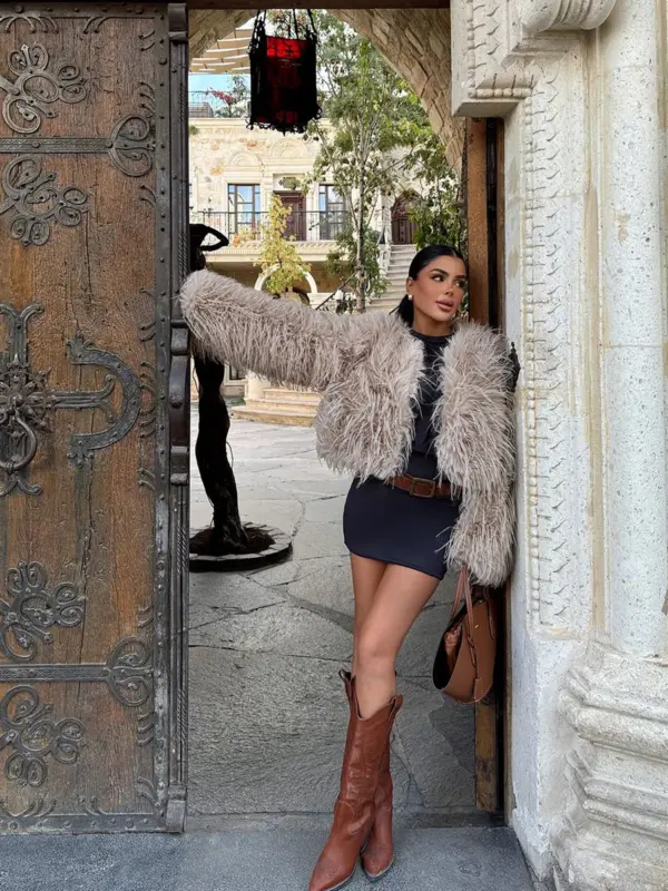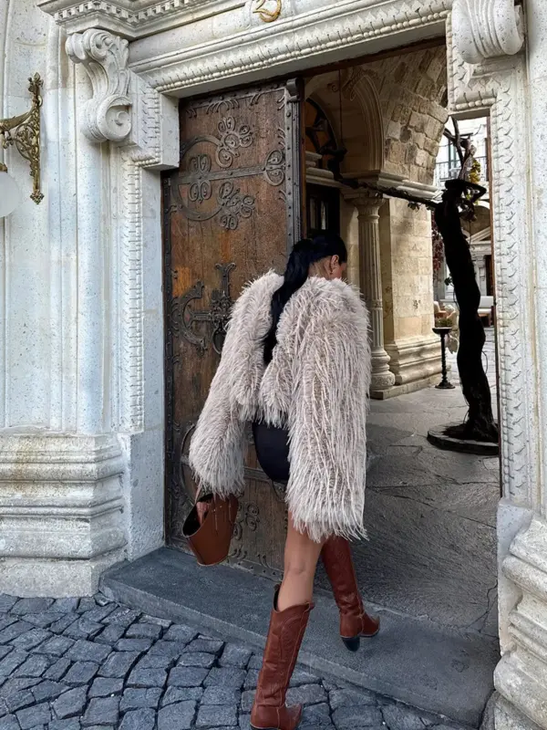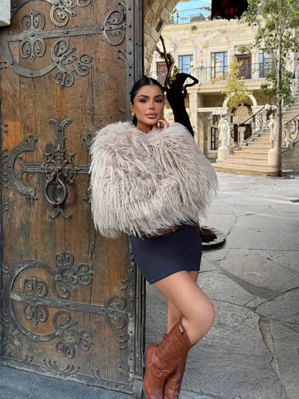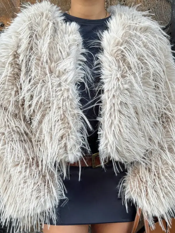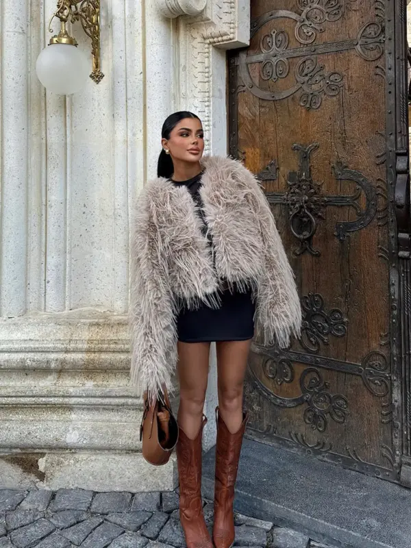 Elegantna kratka jakna od umjetnog krzna bez kopčanja, dizajnirana da dodaje luksuzan izgled svakoj kombinaciji. Zahvaljujući jednostavnom kroju, lako se uklapa uz svečane i svakodnevne outfite, pružajući toplinu i stil u jednom.