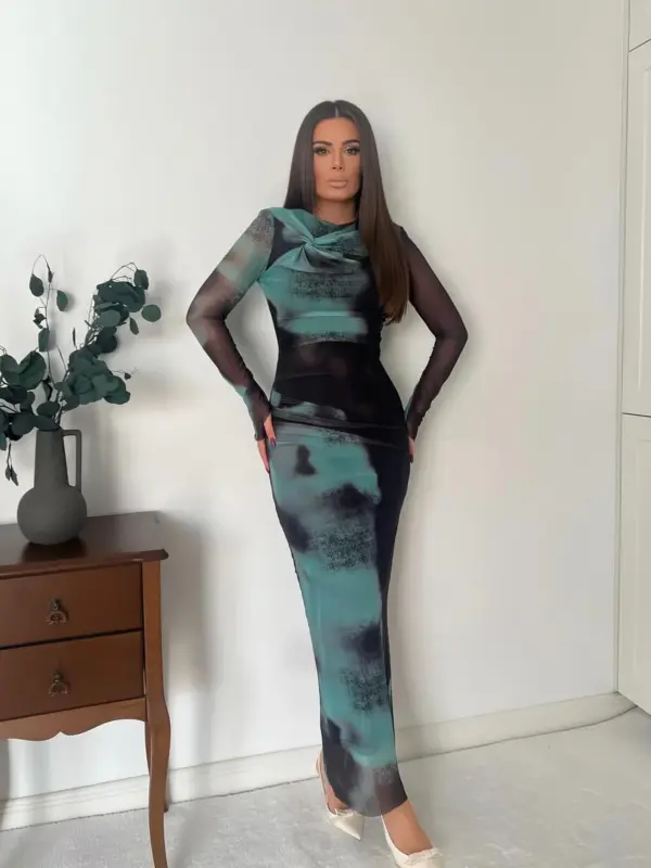 Elegantna midi haljina s apstraktnim printom na tilu koji prekriva podstavu, idealna za odvažne modne kombinacije. Haljina prati liniju tijela, dok umetnute spužve na ramenima dodaju strukturu i definiciju. Rubovi nisu obrađeni, što doprinosi modernom i ležernom izgledu. Haljina je podstavljena za dodatnu udobnost, a zatvara se zipperom na leđima za lako oblačenje.