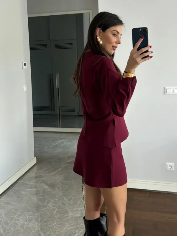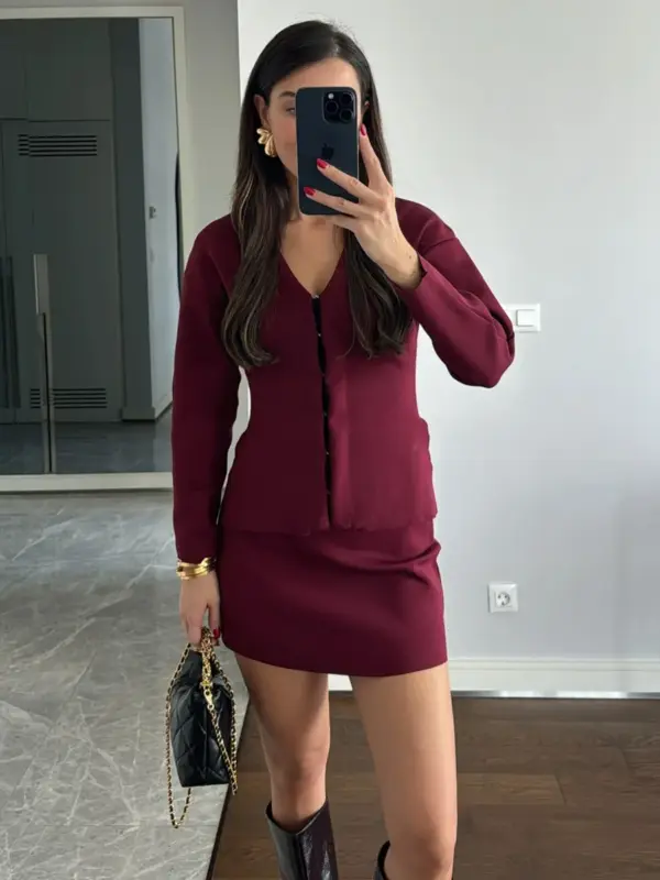 Dvodjelni triko set sastoji se od mini suknje i strukiranog gornjeg dijela. Suknja ima elastičnu gumu u struku za udobnost, dok gornji dio dolazi s skrivenim kopčanjem. Set ima elastina, za bolje prijanjanje i udobnost,. Ovaj set savršeno naglašava figuru, a istovremeno pruža osjećaj udobnosti i elegancije.