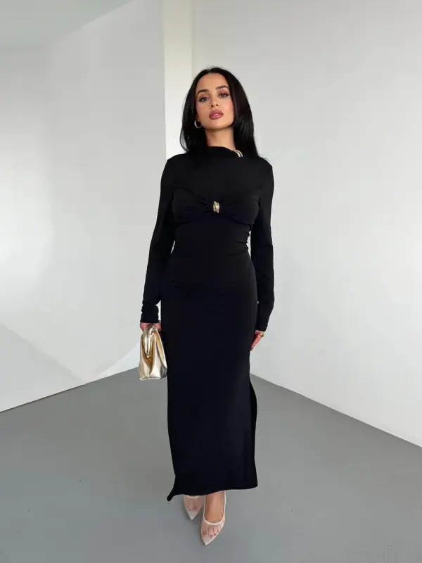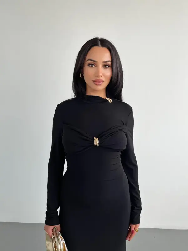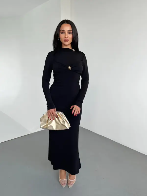 Ova haljina je idealna za večernje izlaske, s glamuroznim zlatnim detaljima koji dodaju sofisticiranost! 🌟