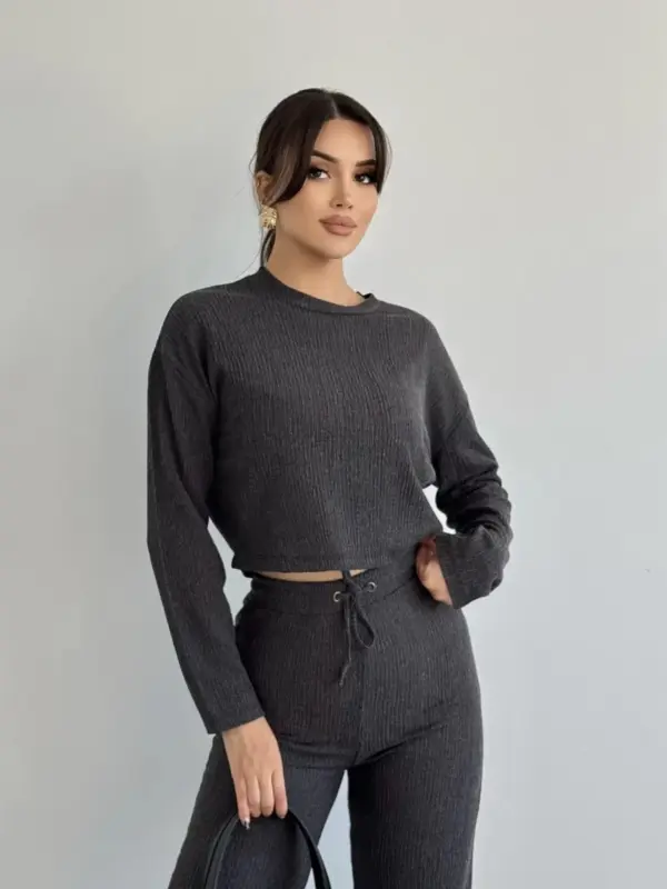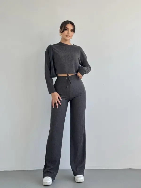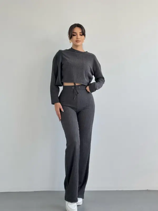 Dvodjelni set koji se sastoji od kraćeg blago šireg gornjeg dijela, nije potpuno pripijen uz tijelo, te donjeg dijela s palazzo nogavicama koje nisu previše široke i gumom u struku. Ovaj set pruža savršen balans između udobnosti i stila, idealan za ležerne dnevne kombinacije.