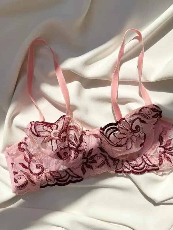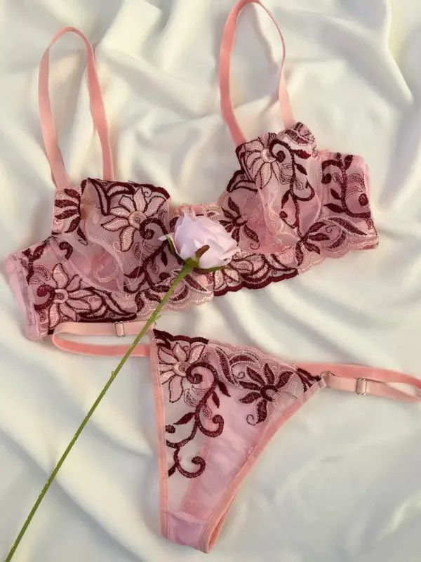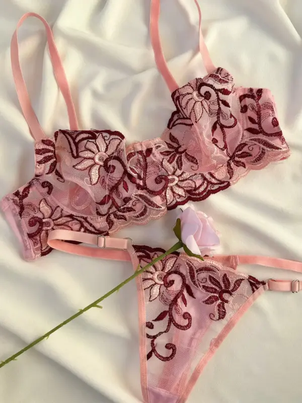 Dvodjelni lingerie set u kombinaciji mrežice i veza s podesivim naramenicama na gornjem dijelu i podesivom širinom u struku. Upute za održavanje: pranje na 30°C ili ručno, ne sušiti u sušilici, ne peglati.
