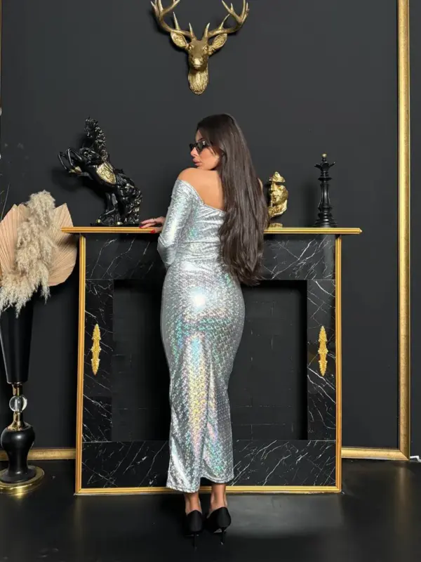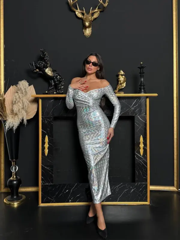 Midi haljina sa spuštenim rukavima i dubokim dekolteom osmišljena za naglašavanje grudi, savršen izbor za partije zahvaljujući svom materijalu.