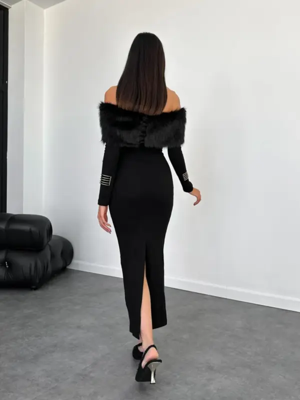Midi triko haljina rebraste strukture donosi spoj udobnosti i elegancije, savršena za hladnije dane. Spuštena ramena ističu ženstvenu siluetu, dok detalj imitacije krzna koji ide preko ruku dodaje sofisticiran i luksuzan izgled.