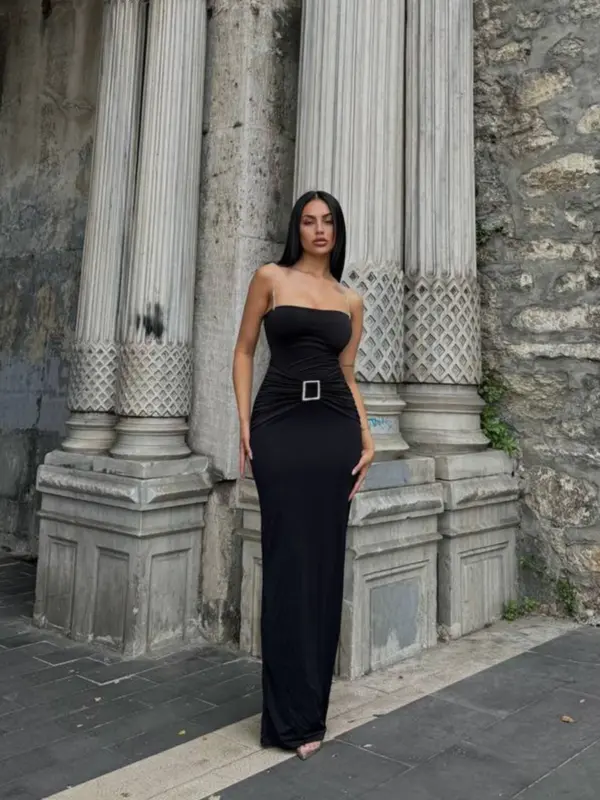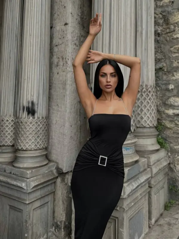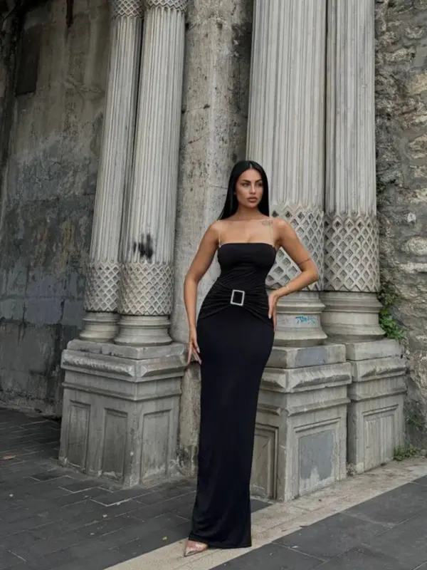 Uska rastezljiva maxi haljina koja savršeno prati liniju tijela, s kratkim izrezom pozadi za lakše koračanje. Naramenice su izrađene u obliku lanca, pa je važno izbjegavati zatezanje kako bi se spriječilo oštećenje. Nabrani detalj u sredini dodatno naglašava struk i oblikuje figuru. Podstavljen gornji prednji dio, blago providna.
