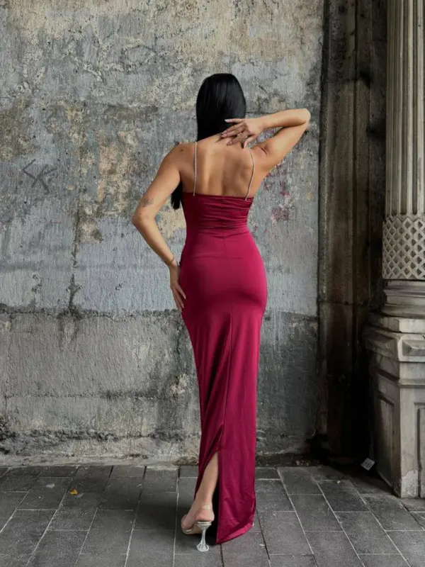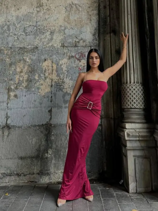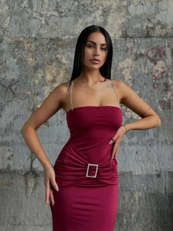 Uska rastezljiva maxi haljina koja savršeno prati liniju tijela, s kratkim izrezom pozadi za lakše koračanje. Naramenice su izrađene u obliku lanca, pa je važno izbjegavati zatezanje kako bi se spriječilo oštećenje. Nabrani detalj u sredini dodatno naglašava struk i oblikuje figuru. Podstavljen gornji prednji dio, blago providna.