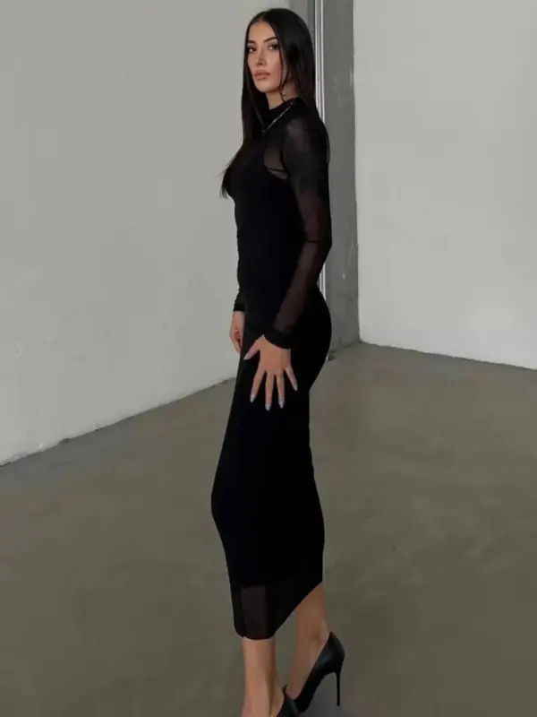 Midi haljina dvoslojnog dizajna savršena za minimalistički, a elegantan izgled. Gornji sloj je od prozračnog tila s ovratnikom, dok donji sloj čini podstava koja osigurava udobnost i neprovidnost. Rubovi nisu obrađeni, što haljini daje ležeran i moderniji izgled.