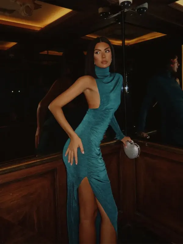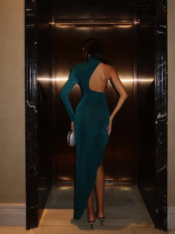 Maxi haljina asimetričnog kroja s jednim rukavom i elegantnim ovratnikom, dizajnirana za sofisticiran i odvažan izgled. Spužvica na ramenu dodaje strukturu, dok duboki izrez sa strane noge ističe ženstvenu siluetu. Idealna za posebne prilike i večernje izlaske.