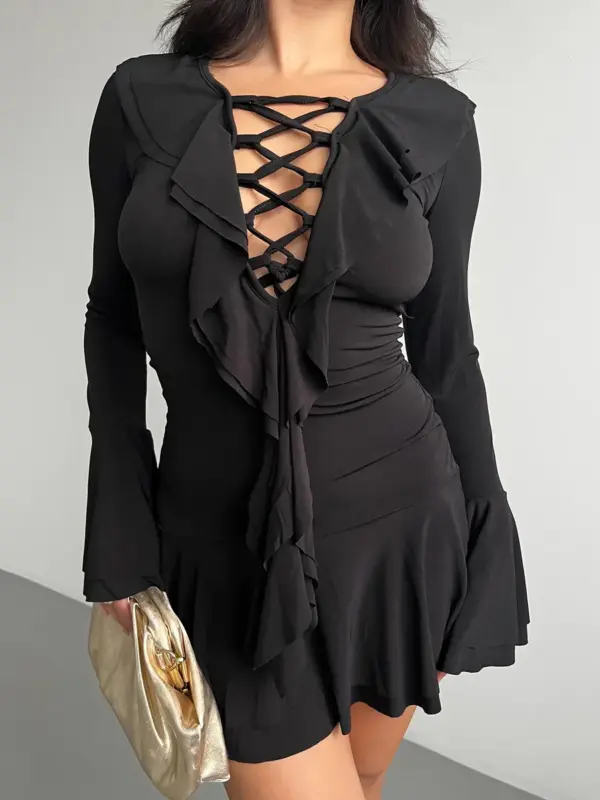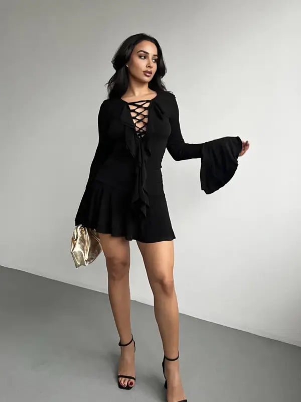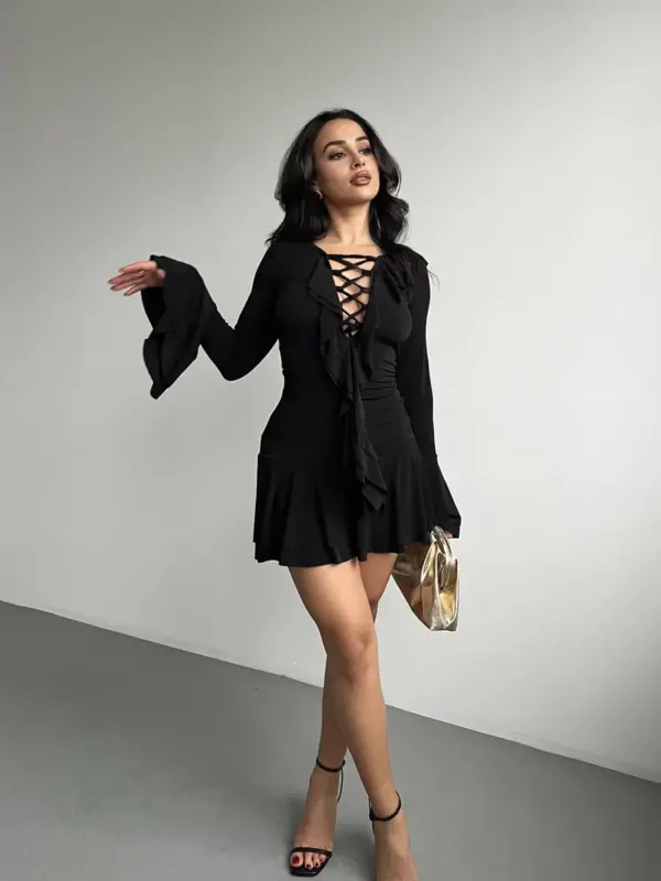Mini haljina retro stila s detaljem vezanja sprijeda i volanima na rukavima i donjem dijelu. Ovaj model nudi nostalgičan izgled s modernim twistom, idealan za odvažne i trendi kombinacije.