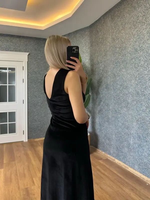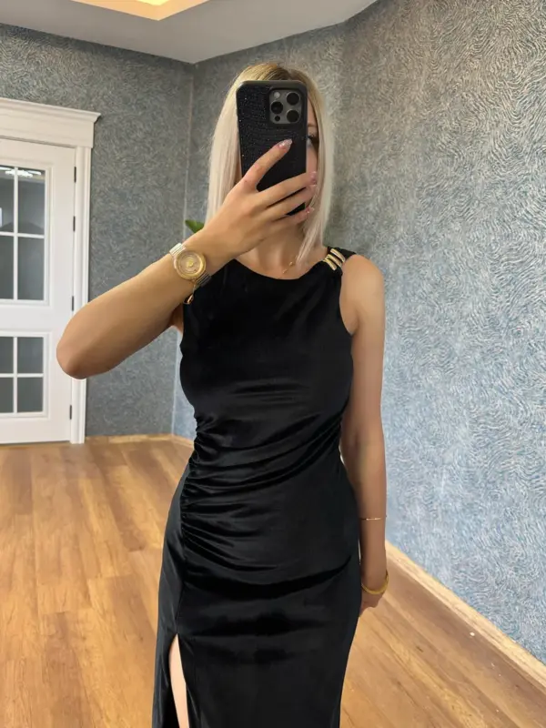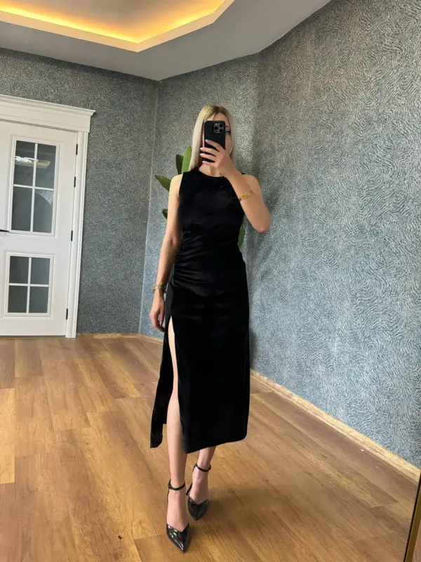 Midi haljina od plišanog materijala, bez rukava, s elegantnim detaljem na ramenu. Nabrana u struku za naglašavanje figure, s dubokim izrezom na nozi koji dodaje dozu senzualnosti i sofisticiranosti. Pri dnu se blago širi.