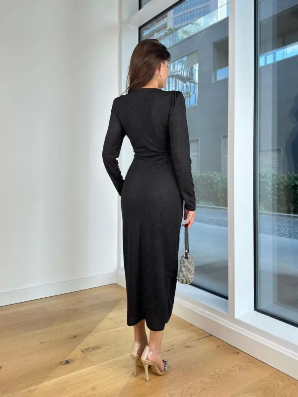Midi haljina s elegantnim izrezom po sredini i naglašenim strukom za laskavu siluetu. Spužvice na ramenima dodaju strukturu, dok rastezljiv prilagodljiv materijal pruža suptilan i sofisticiran izgled.
