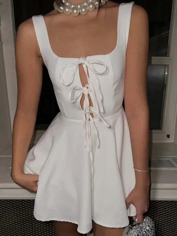 Ultra kratka mini haljina retro stila koja ističe ženstvenost i eleganciju. Gornji dio s detaljem vezanja naprijed naglašava dekolte, dok je struk presječen za isticanje figure. Donji dio haljine se širi, a podstavljena mrežica ispod pruža dodatni volumen i retro šarm. Idealna za svečane prilike ili večernje izlaske. Zipper nazad za lakše oblačenje, podstavljena, nositi neutralne boje ispod.