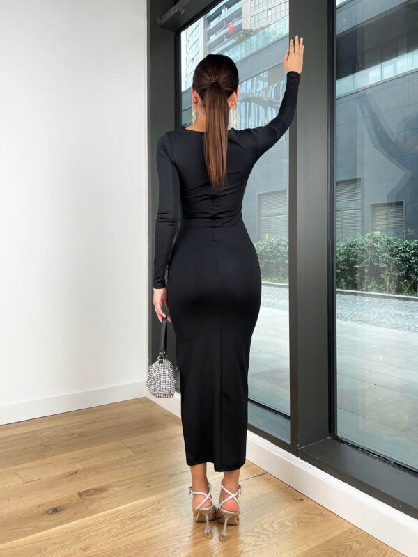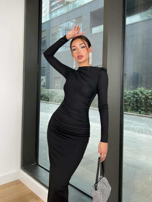 Midi haljina od rastezljivog materijala, jednostavna i elegantna. Nabori u struku naglašavaju figuru, a rastezljiv materijal osigurava udobnost i savršeno prilagođavanje tijelu.