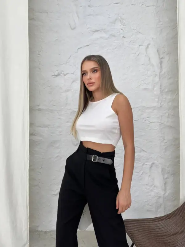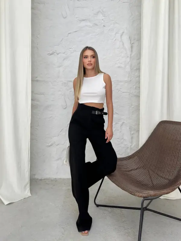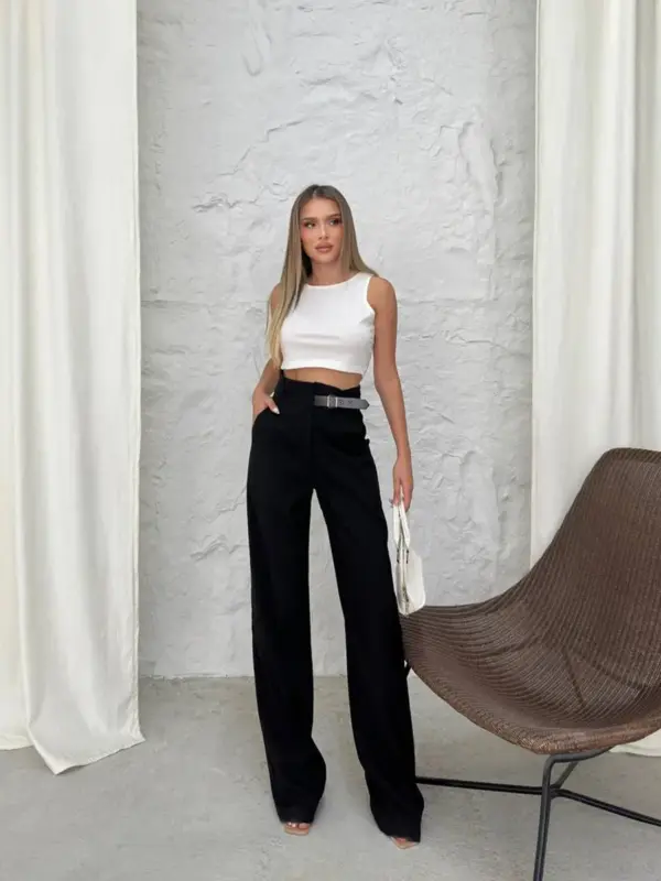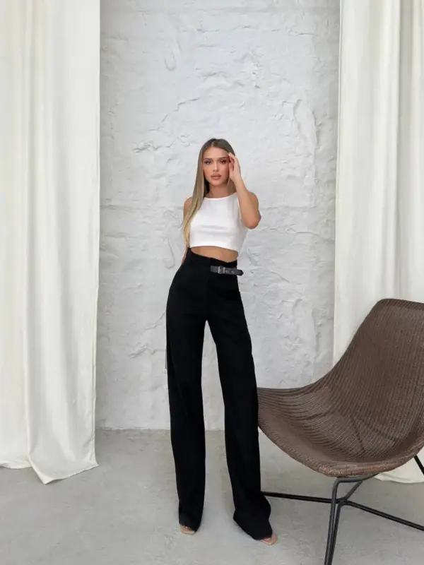 Platnene palazzo hlače visokog struka, savršen izbor za elegantan i sofisticiran izgled. Ove hlače dolaze s praktičnim detaljem poluremena koji omogućava prilagodbu struka, a koji je fiksiran i ne može se skidati. Dizajnirane su s funkcionalnim džepovima i kopčanjem na skriveni patentni zatvarač, pružajući savršen spoj stila i praktičnosti.