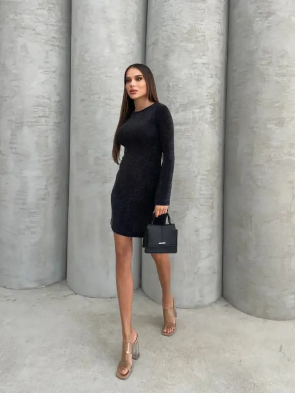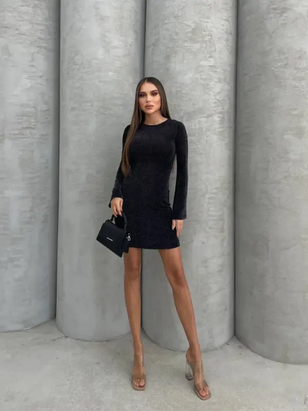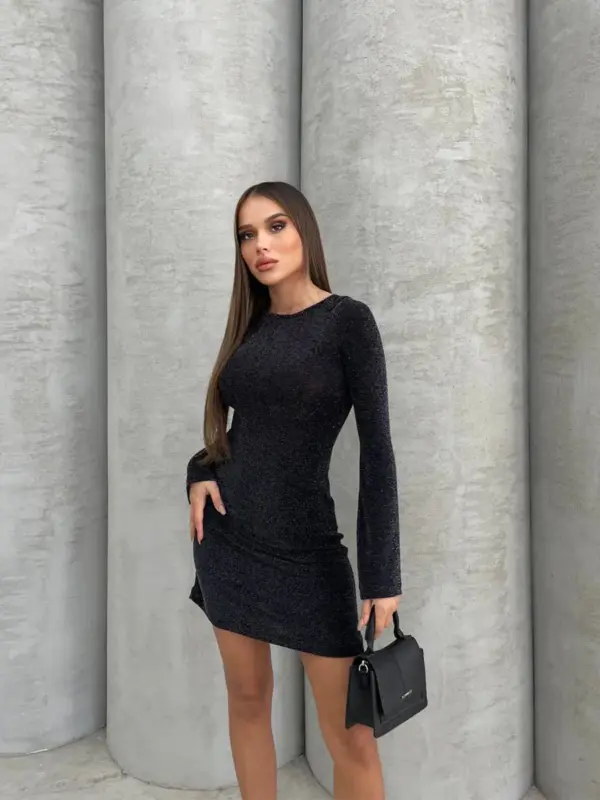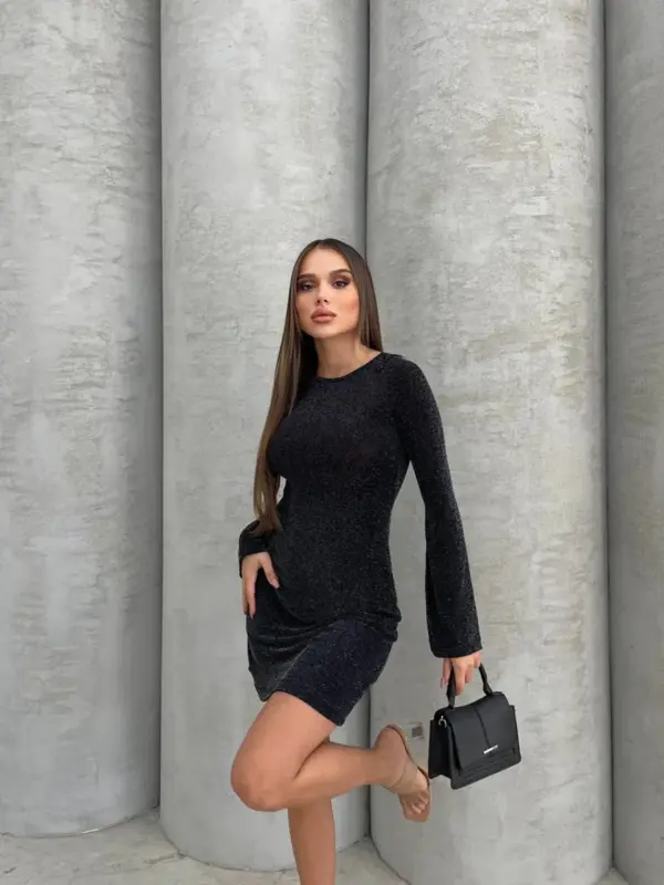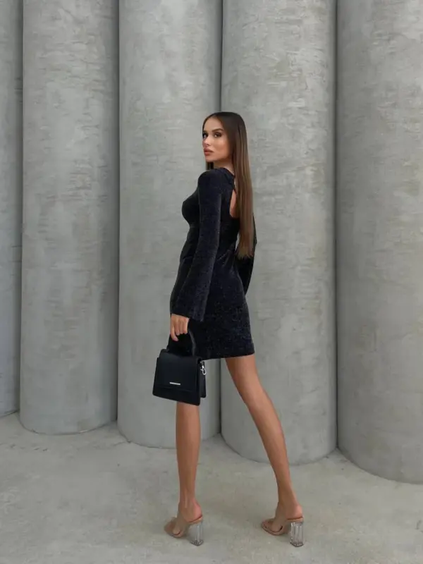 Mini haljina za one koji vole da se istaknu, izrađena od svjetlucavog materijala koji privlači pažnju i obogaćena elegantnim zvonastim rukavima. Haljina ima otvorena leđa s detaljem vezanja, što dodatno naglašava sofisticiran i zavodljiv stil. Jednostavan, ali upečatljiv dizajn čini je idealnim izborom za večernje izlaske ili svečane prilike. Šljokice ne opadaju.