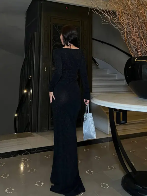 Maxi haljina elegantnog i svečanog dizajna, idealna za posebne prilike. Ova haljina ima dubok, naglašen dekolte i duboki izrez na nozi, što joj daje zavodljiv i sofisticiran izgled. Izrađena je od svjetlucavog materijala koji osigurava da budete u centru pažnje, a pritom ne sadrži šljokice koje opadaju. Na grudima su umetnute spužvice za dodatnu podršku i oblikovanje.