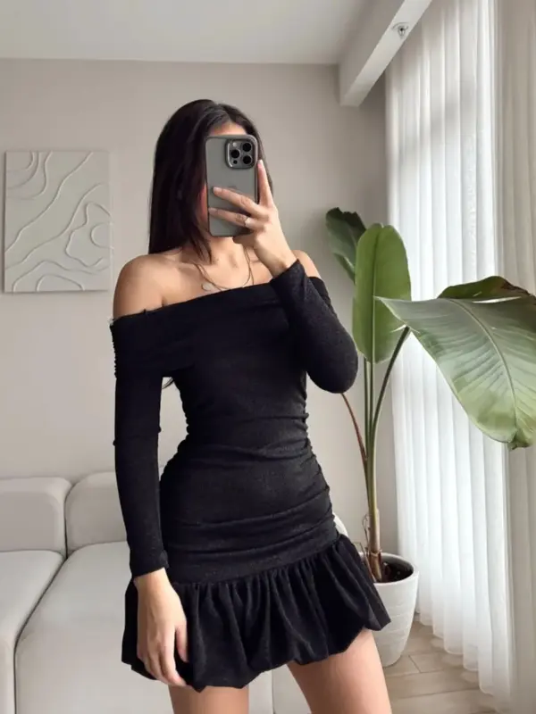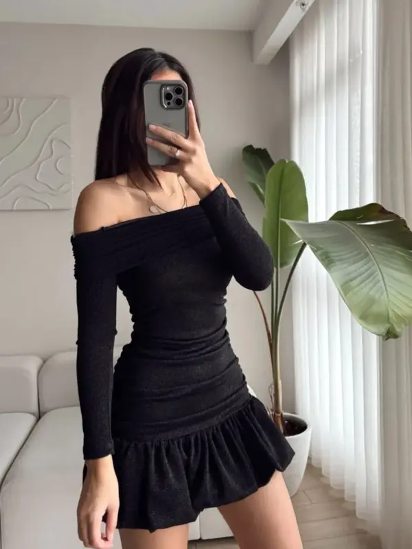 Mini haljina od svjetlucavog materijala idealna za one koji vole da se istaknu. Dizajn sa spuštenim ramenima ističe eleganciju, dok rastezljiv kroj prati liniju tijela za savršeno pristajanje. Volani pri dnu dodaju romantičan i dinamičan završetak. Materijal ne sadrži šljokice koje opadaju, što je čini praktičnom za nošenje.
