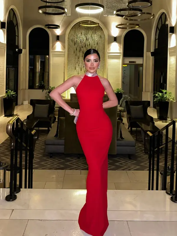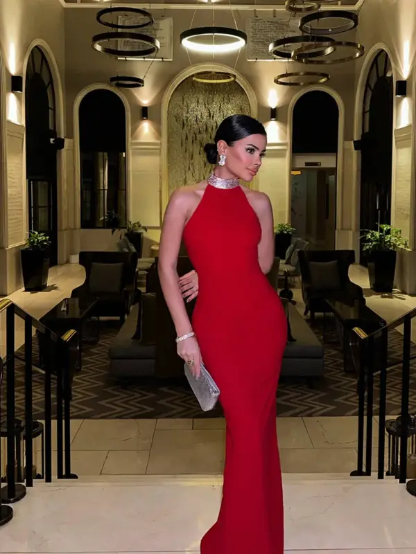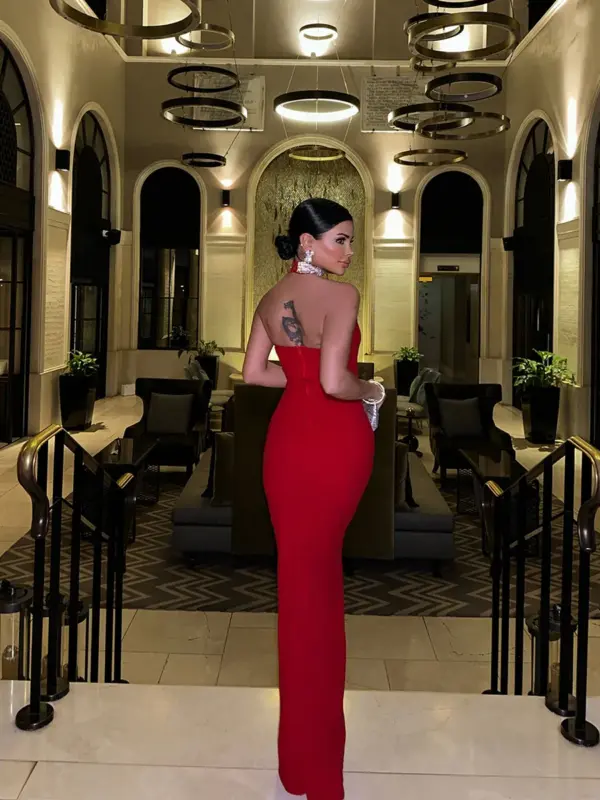Maxi haljina elegantnog dizajna koja prati liniju tijela i ističe figuru na sofisticiran način. Ova uska haljina bez leđa odiše profinjenošću, dok okovratnik ukrašen detaljima cirkona dodaje dašak luksuza. Jednostavan kroj i rastezljiv materijal s elastinom osiguravaju udobnost i savršeno pristajanje. Zipper na leđima olakšava oblačenje, čineći je idealnim izborom za svečane događaje ili glamurozne večeri.