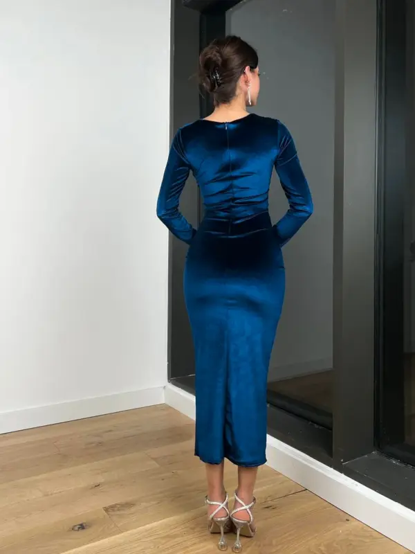 Midi haljina od plišanog materijala, jednostavna i elegantna. Nabori u struku naglašavaju figuru, a rastezljiv materijal osigurava udobnost i savršeno prilagođavanje tijelu. Zipper pozadi omogućava lako oblačenje.