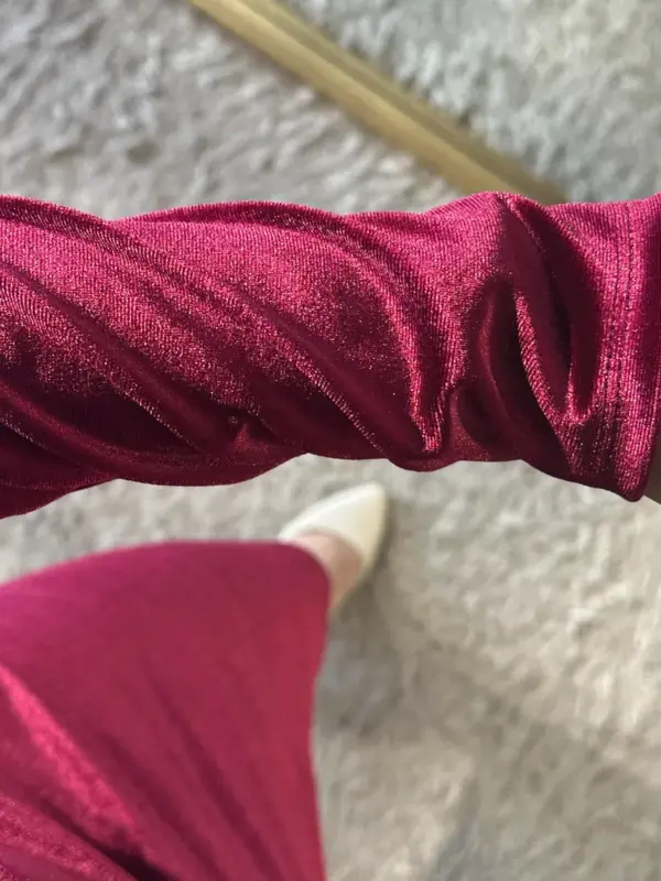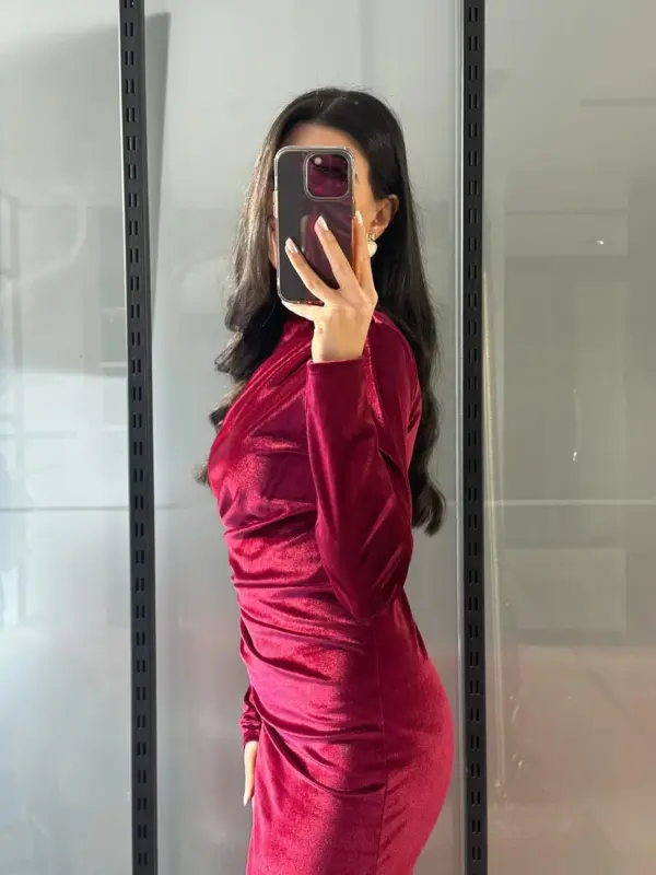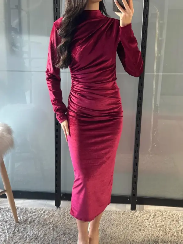 Midi haljina od plišanog materijala, jednostavna i elegantna. Nabori u struku naglašavaju figuru, a rastezljiv materijal osigurava udobnost i savršeno prilagođavanje tijelu. Zipper pozadi omogućava lako oblačenje.