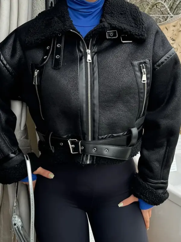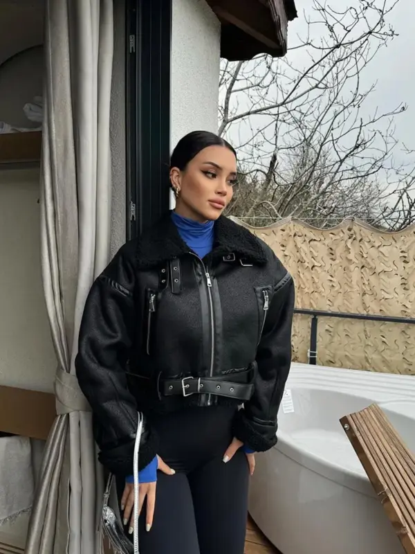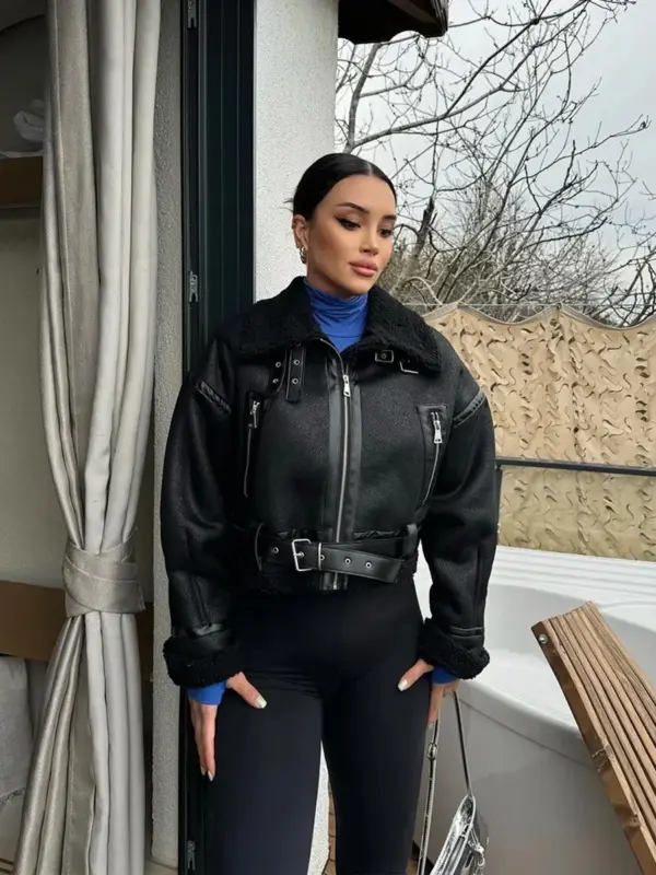 Ova cropped jakna izrađena je od umjetne brušene kože s toplom unutrašnjošću od imitacije janjećeg runa, savršena za hladne dane kada želite izgledati moderno i osjećati se ugodno. Preklop sa patentnim zatvaračem pruža dodatnu zaštitu od vjetra, dok skraćeni kroj naglašava struk i čini jaknu idealnom za slojevite kombinacije.
