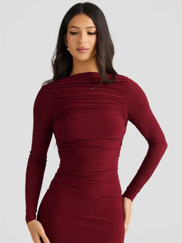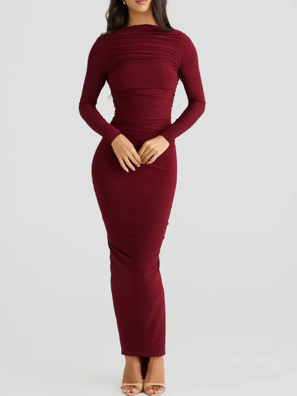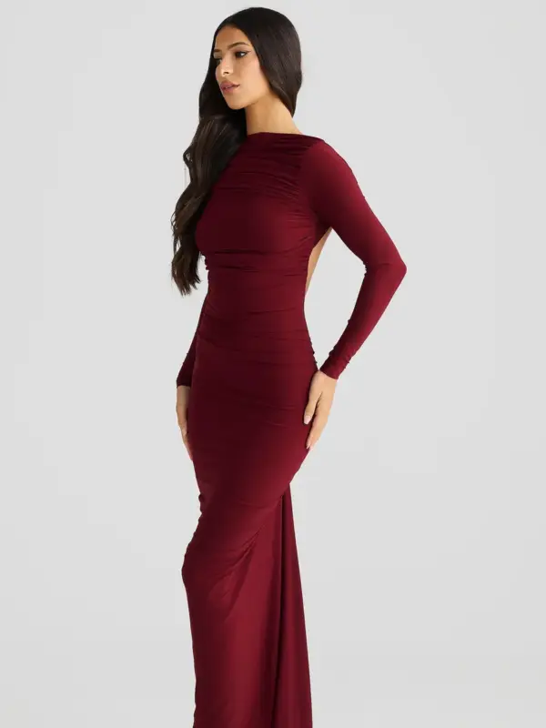 Ova elegantna maxi haljina s otvorenim leđima idealna je za svečane prilike. Izrađena od rastezljivog materijala, haljina savršeno prati obline tijela, dok dugi rukavi dodaju sofisticiranost. Nabrani detalji na donjem dijelu leđa i stražnjici naglašavaju siluetu, čineći ovaj komad izuzetno laskavim.