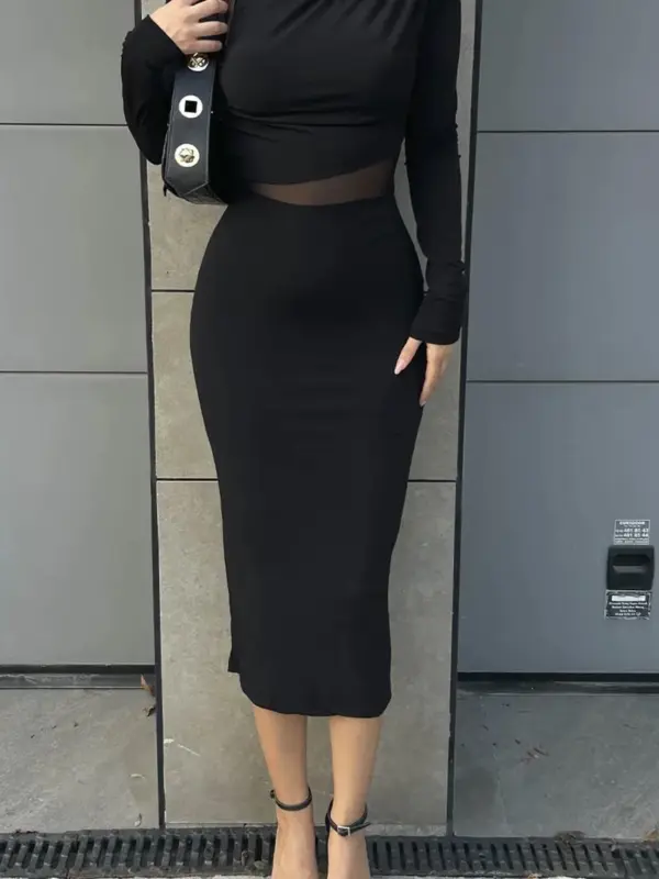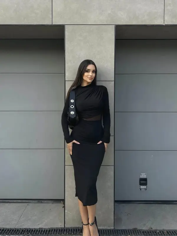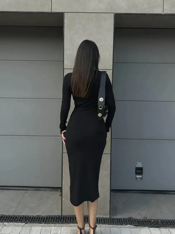 Midi haljina od rastezljivog materijala, jednostavna i elegantna. Nabori i prorez u struku naglašavaju figuru, a rastezljiv materijal osigurava udobnost i savršeno prilagođavanje tijelu.