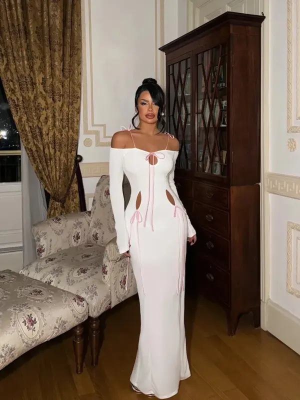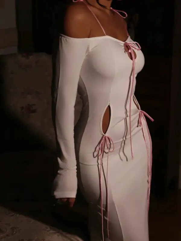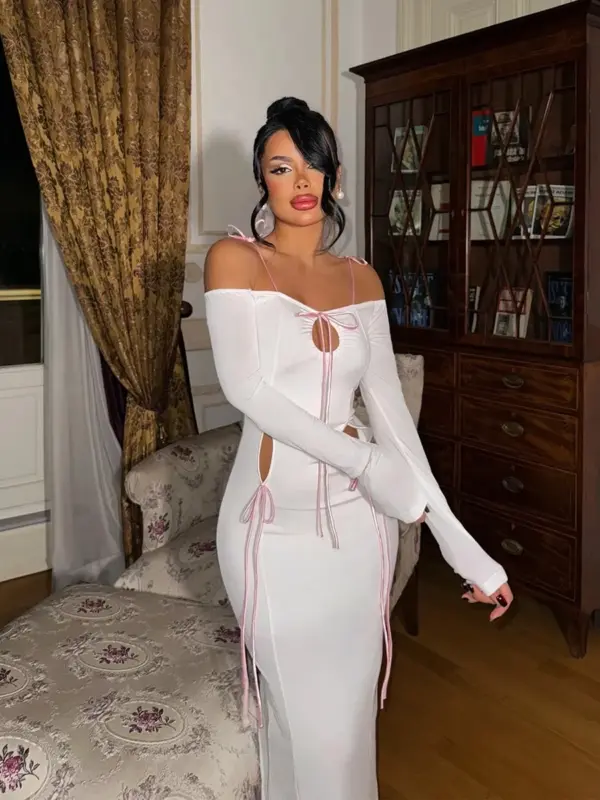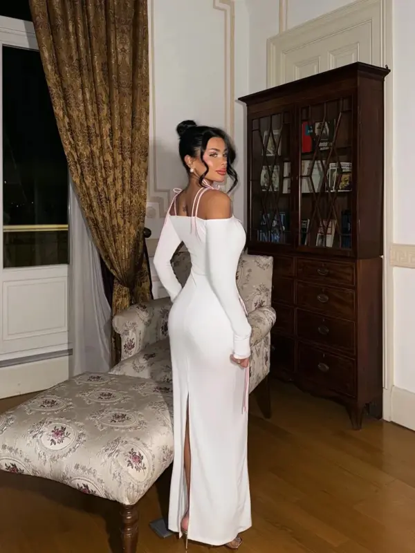 Istaknite svoj stil uz ovu zanimljivu maxi haljinu koja spaja eleganciju i odvažnost. Uski kroj prati liniju tijela, dok smjeli prorezi dodaju dozu drame i senzualnosti. Detalji mašne pružaju jedinstvenu i sofisticiranu notu. Idealan izbor za posebne prilike. Haljina je podstavljena ali ipak bismo savjetovali nositi neutralne boje ispod.