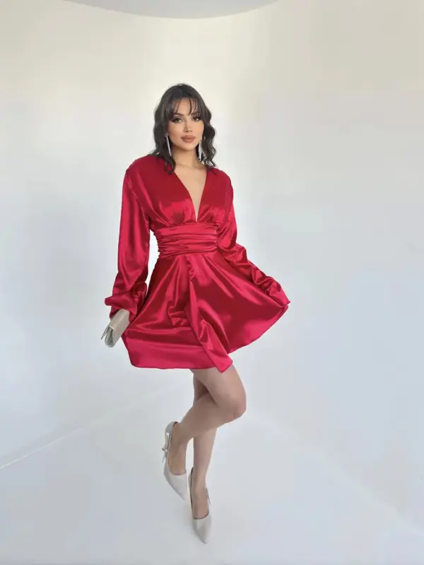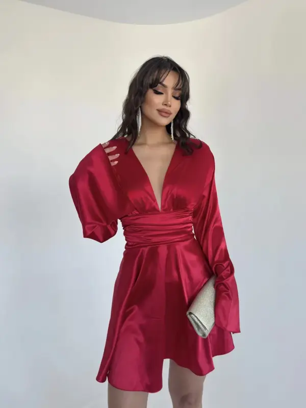 Unesite dozu glamura i sofisticiranosti uz ovu lepršavu mini haljinu od satena, savršenu za posebne prilike. Široki zvonasti rukavi i duboki dekolte daju ženstvenu siluetu, dok presjek u struku ističe vašu figuru. Haljina se blago širi prema dnu, dodajući elegantan i romantičan efekt.
