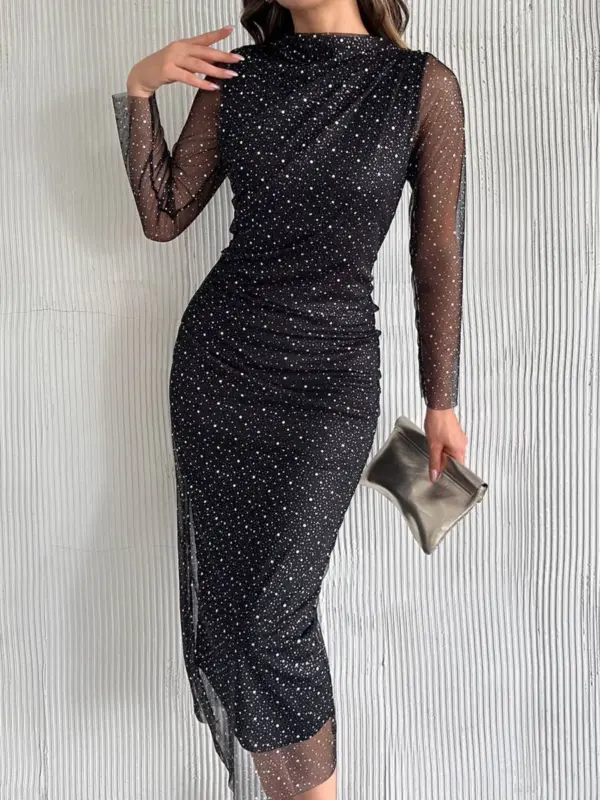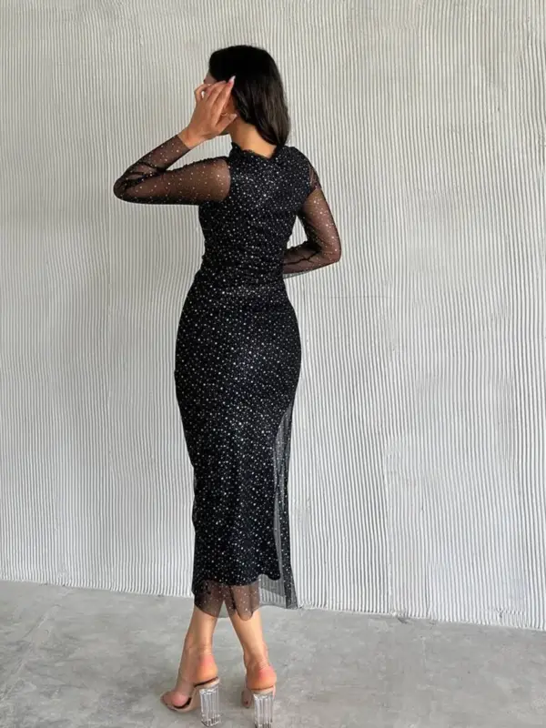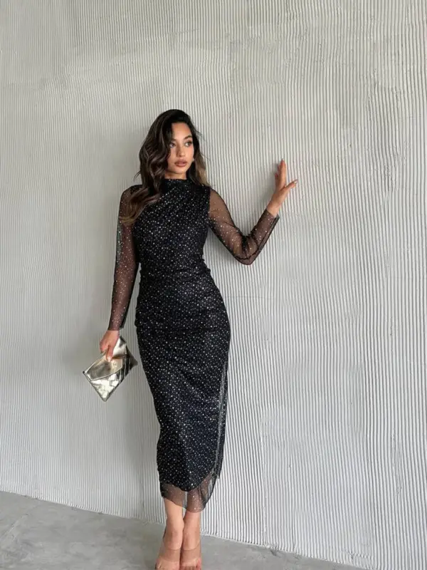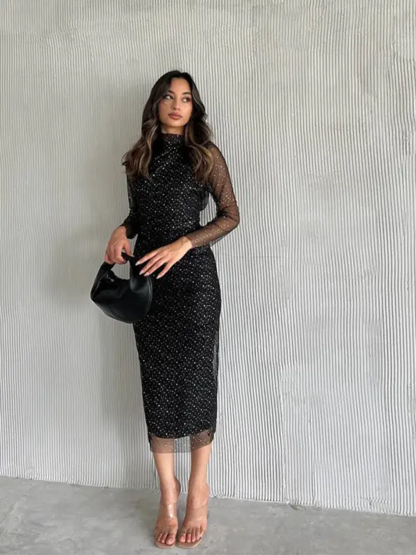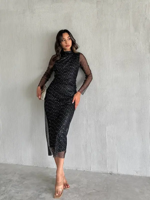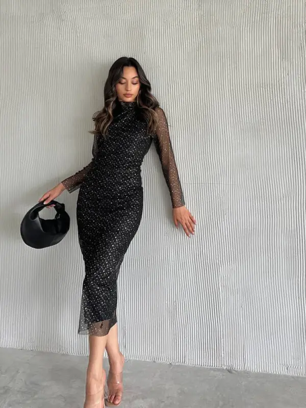 Midi haljina od dva sloja – podstave i tila sa šljokicama koje ne opadaju preko. Nabori u struku naglašavaju figuru, a rastezljiv materijal osigurava udobnost i savršeno prilagođavanje tijelu.