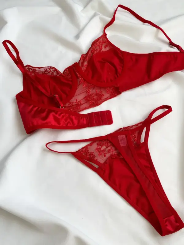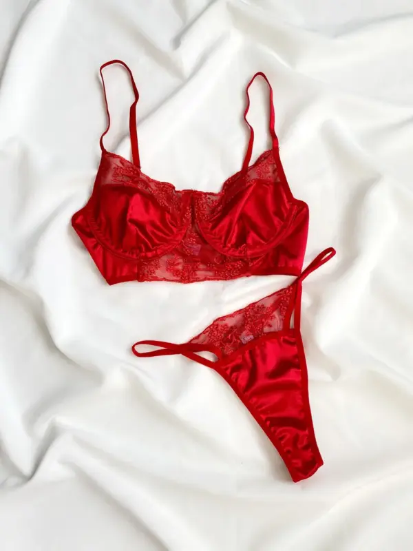Dvodjelni lingerie set u kombinaciji platna i čipke s podesivim naramenicama na gornjem dijelu. Upute za održavanje: pranje na 30°C ili ručno, ne sušiti u sušilici, ne peglati.
