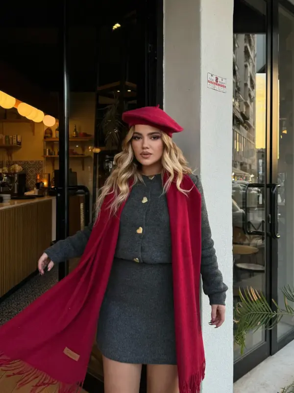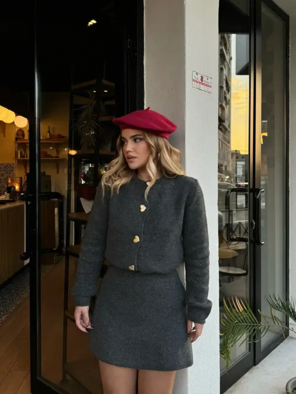 Unesite toplinu i udobnost u svoj zimski stil s ovim dvodjelnim pletenim setom, koji spaja funkcionalnost i šarmantan dizajn. Gornji dio dolazi s detaljima u obliku gumbića reljefne strukture srca sa zlatnim uzorkom, dodajući sofisticiranost i ženstvenost. Donji dio je mini suknja, koja savršeno upotpunjuje izgled i naglašava figuru.
