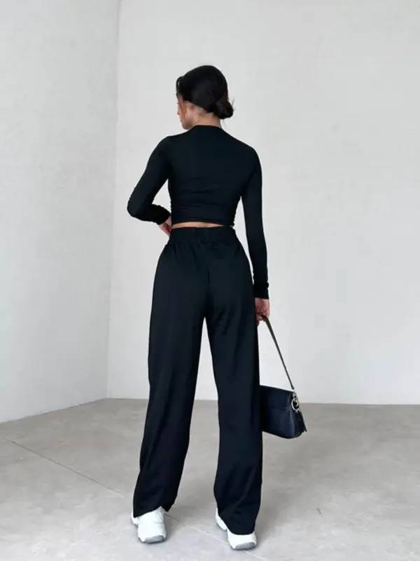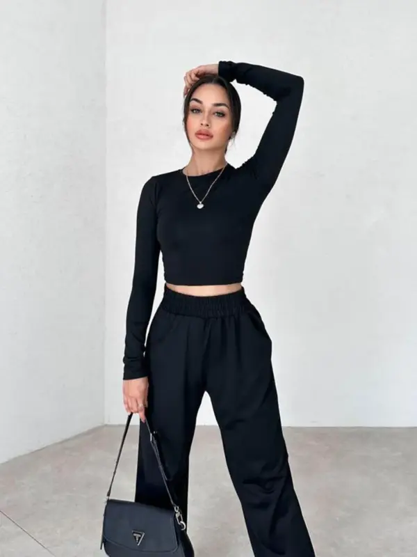 Udobni dvodjelni set sa elastinom. Gornji dio uzak uz tijelo, crop model. Donji dio širi sa gumom u struku. Blago providno, preporučujemo nositi neutralne boje ispod.