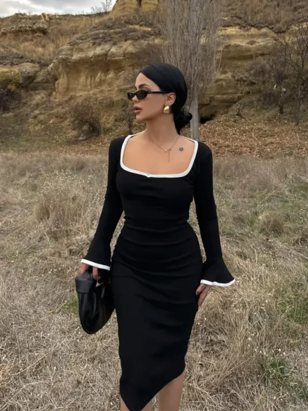Ova midi haljina spoj je udobnosti i modernog dizajna. Rebrasta struktura osigurava savršeno pristajanje, dok kontrastne pruge vizuelno oblikuju figuru i ističu ženstvene linije.