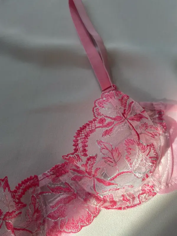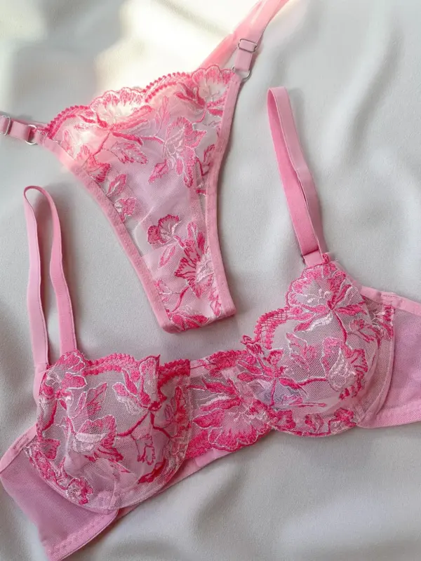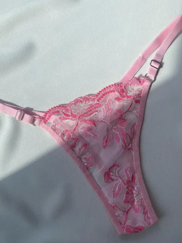 Dvodjelni lingerie set u kombinaciji mrežice i veza s podesivim naramenicama na gornjem dijelu i podesivom širinom u struku.