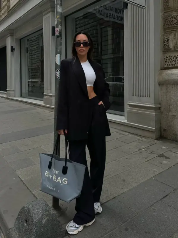 Ovo oversize odijelo savršen je spoj ležernosti i elegancije! Basic sako dolazi u širem kroju, sa spužvicama na ramenima za dodatnu strukturu, dok donji dio ima široke, lagano lepršave nogavice koje prate pokret tijela i pružaju maksimalnu udobnost.