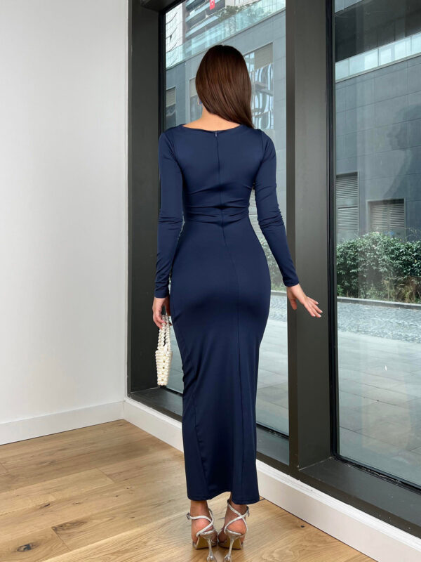 Midi haljina od rastezljivog materijala, jednostavna i elegantna. Nabori u struku naglašavaju figuru, a rastezljiv materijal osigurava udobnost i savršeno prilagođavanje tijelu.