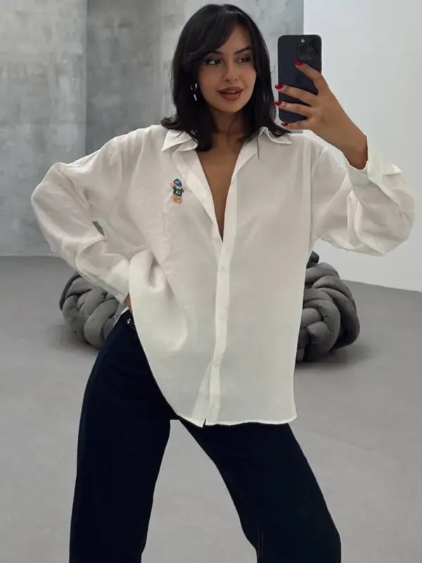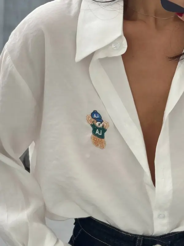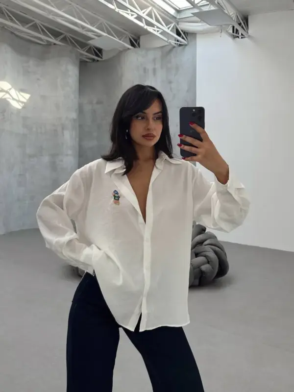 Oversize košulja sa izvezenim medom . Ova ležerna košulja dolazi u širem kroju, pružajući opušten i trendi izgled. Detalj mede, izrađen tehnikom veza, unosi dozu unikatnosti i razigranosti. Možete je nositi kao samostalan komad ili slojevito u kombinaciji s topovima i džinsom.