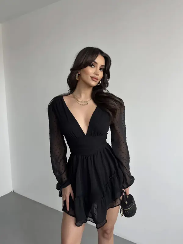 Ova zavodljiva mini haljina spaja stil i praktičnost! Širi, lagani rukavi daju joj lepršav izgled, dok duboki V-izrez ističe dekolte na elegantan način. Presjek u struku dodatno naglašava figuru, a skriveni šorc omogućava udobnost i sigurnost pri nošenju. Zatvara se ziperom na leđima, čime osigurava savršeno prijanjanje.