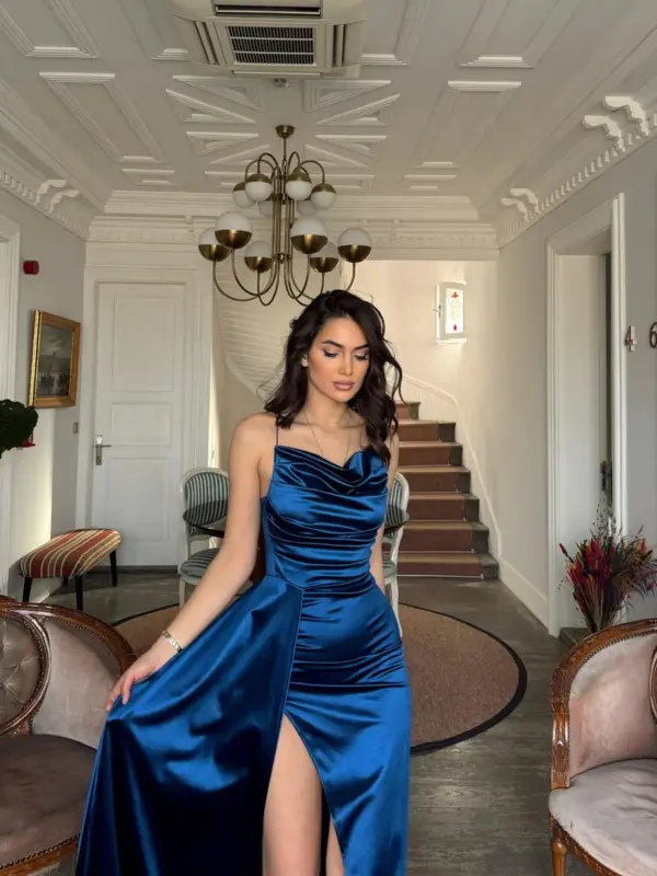 Elegantna maxi haljina od debljeg satena. Nabrana u gornjem dijelu i presječena po sredini, naglašava struk i stvara predivnu figuru. Rajfešlus sa strane omogućava jednostavno oblačenje, čineći je savršenim izborom za posebne prilike.