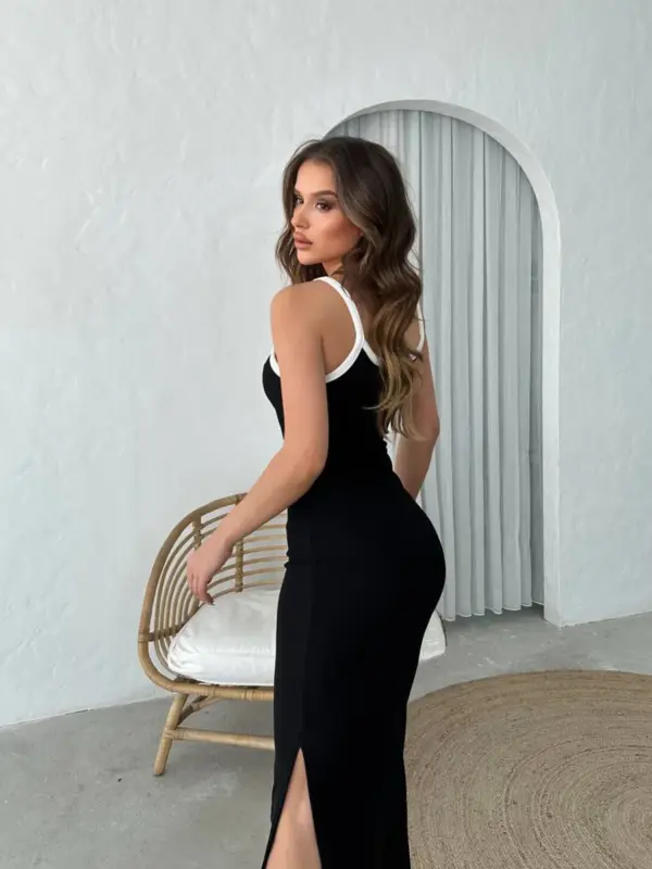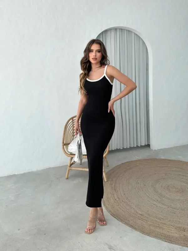 Uska midi haljina rebraste strukture s izrezom i kontrastnim naramenicama ✨