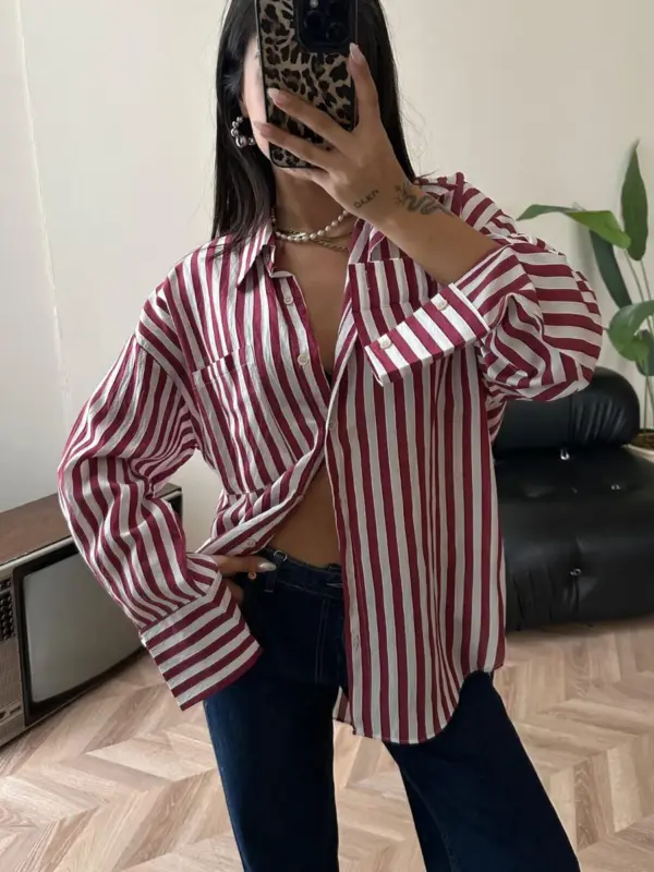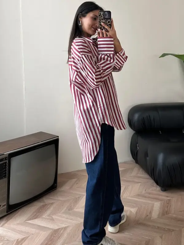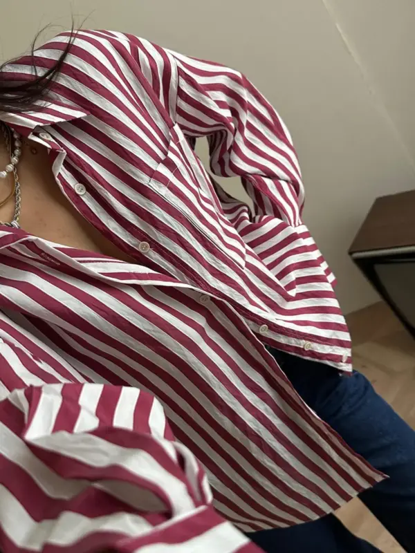 Ova modern, prozračna košulja s prugastim uzorkom idealna je za ležerne i chic kombinacije. Širi kroj i duži stražnji dio daju opušten izgled, dok lagani materijal pruža udobnost tokom cijelog dana. Možete je nositi uz farmerice, pantalone ili preko topa za slojeviti stil.