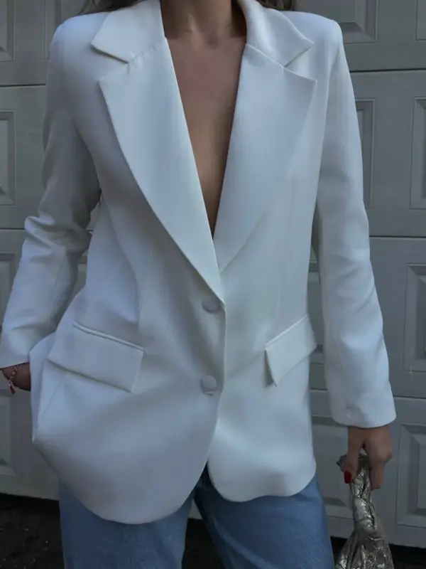 Elegantni duži sako s blago strukiranim krojem koji ističe figuru. Spužvice na ramenima dodaju sofisticiran izgled, dok klasičan dizajn omogućava lako kombinovanje u različitim outfitima – od poslovnih do večernjih.