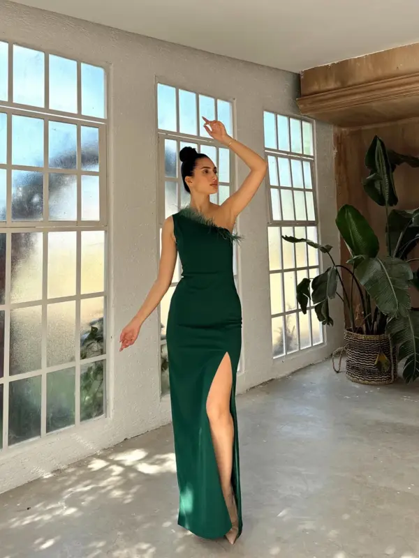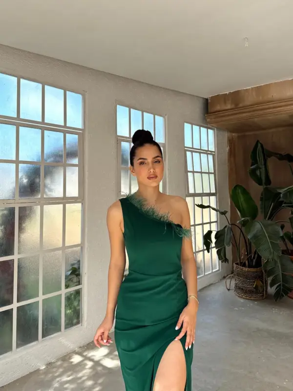 Ova zavodljiva maxi haljina na jedno rame odiše luksuzom i elegancijom. Asimetričan kroj, duboki izrez na nozi i presjek u struku naglašavaju figuru, dok detalji perja po gornjem obrubu dodaju dašak glamura. Savršen izbor za svečane prilike kada želite da ostavite upečatljiv utisak.