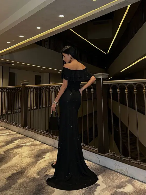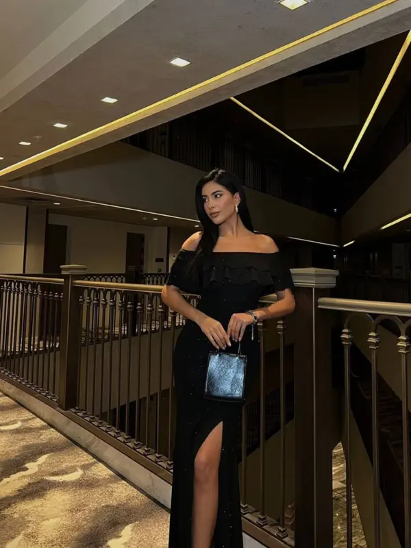 Ova zavodljiva maxi haljina spuštenih ramena odiše sofisticiranošću i lepršavim šarmom. Neobrađeni volani po gornjem obrubu daju joj romantičan izgled, dok rastezljivi materijal i kroj s presjekom u struku naglašavaju figuru. Duboki izrez na nozi dodaje dozu senzualnosti, čineći ovu haljinu idealnim izborom za posebne prilike.
