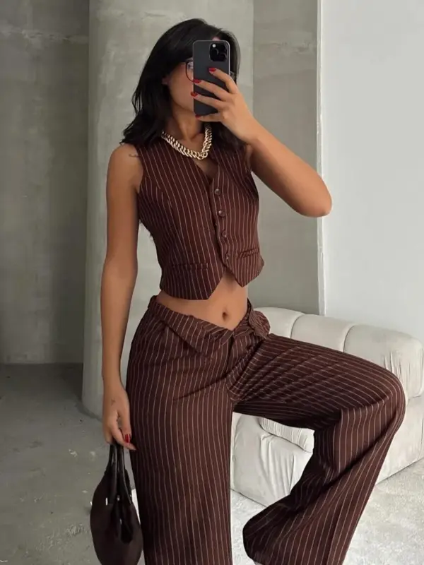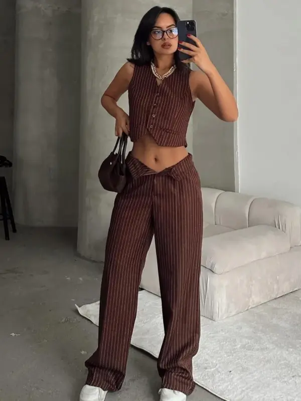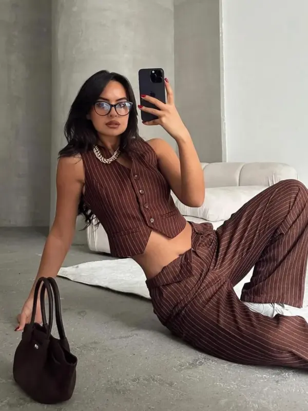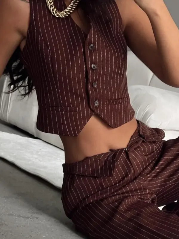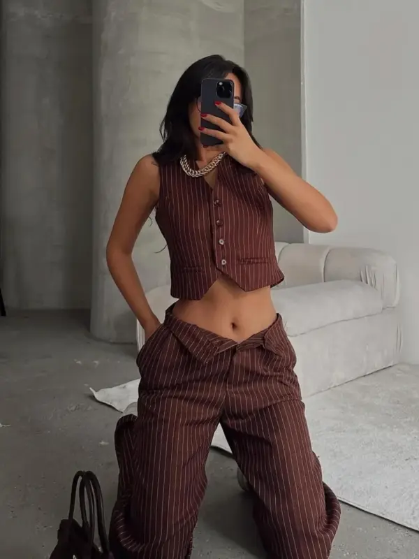 Ovaj stilizirani dvodjelni set kombinuje klasičan prsluk crop kroja i šire palazzo hlače, stvarajući modernu, ali sofisticiranu kombinaciju. Vertikalne pruge vizuelno izdužuju figuru, dok opušteni kroj donosi udobnost i eleganciju. Oba dijela se mogu nositi zajedno za upečatljiv izgled ili kombinovati s drugim komadima za različite prilike – od poslovnog stila do ležernih izlazaka.